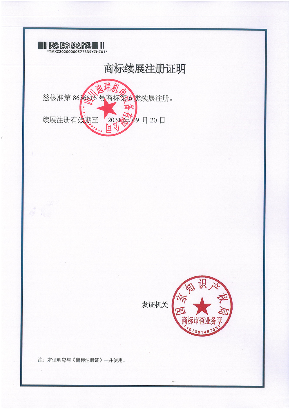 商標(biāo)注冊(cè)證(續(xù)展證)